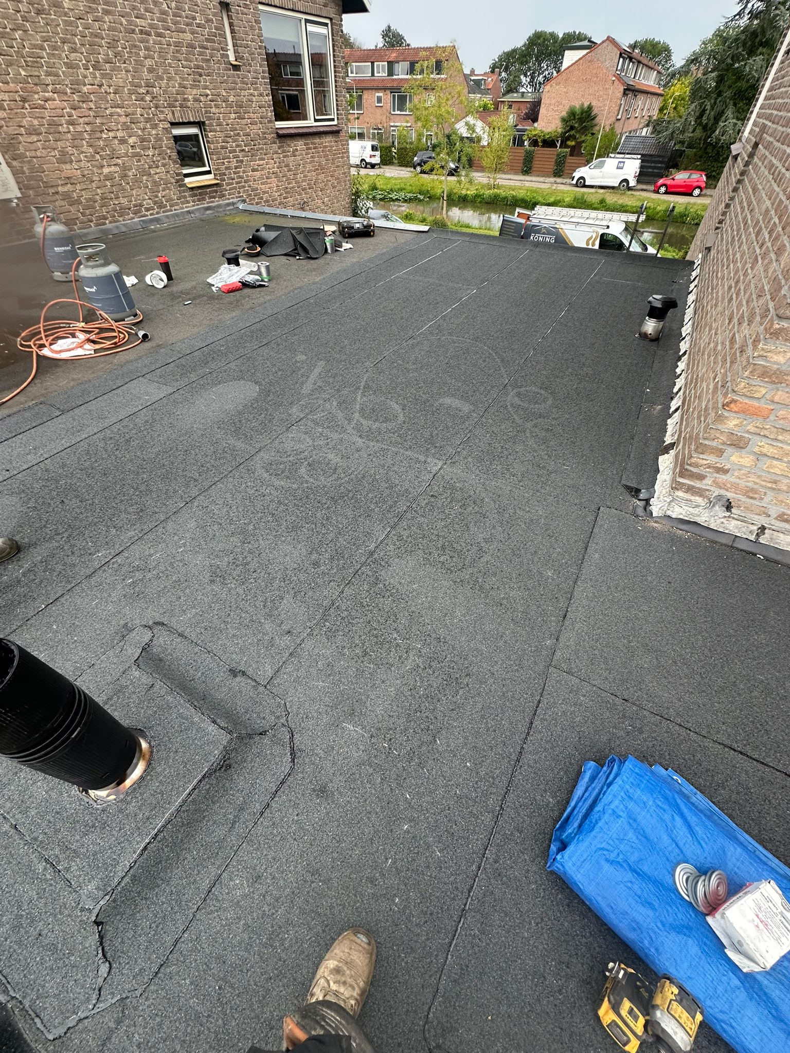 - Plat dak noodreparatie: Lokale reparaties en materiaal: €375,-
